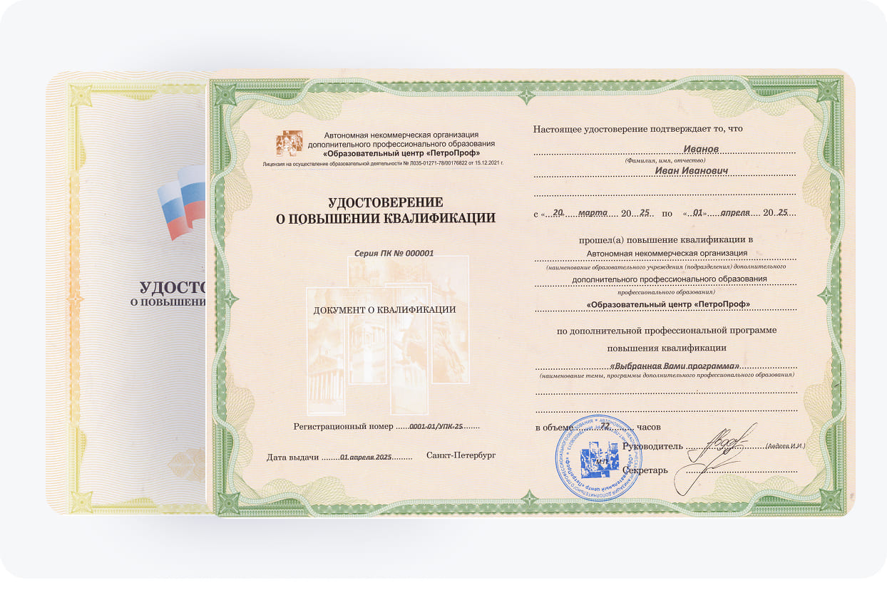 По завершении программы повышения квалификации и аттестации слушатели получают удостоверение о повышении квалификации (УПК). Документ об образовании подтверждает успешное освоение программы и является официальной бумагой, необходимой для дальнейшего карьерного роста и подтверждения уровня профкомпетенций специалиста.